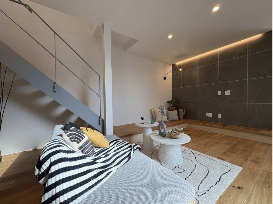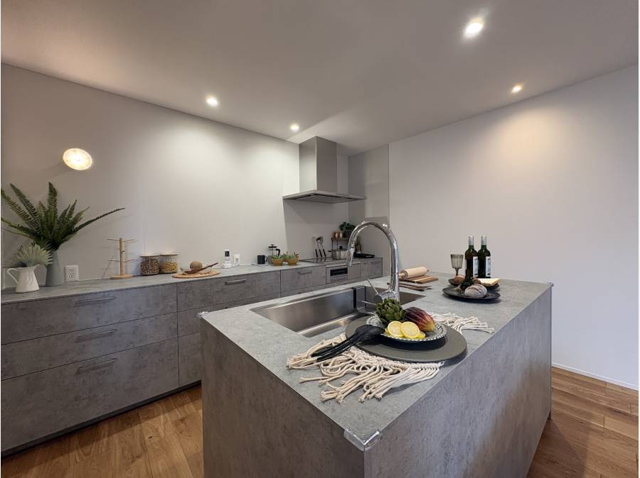 街並みの中で異彩を放つスタイリッシュな外観、そしてLDKには「グラフテクト社」のオープンキッチンを採用。スケルトン階段を上がった先には、ライフスタイルに合わせて活用できるフリースペースが広がります。
