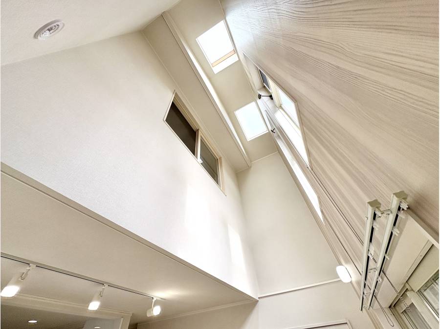 特に、トップライトから光が降り注ぐ吹抜けのリビングは、家族が自然と集まる開放的な空間。