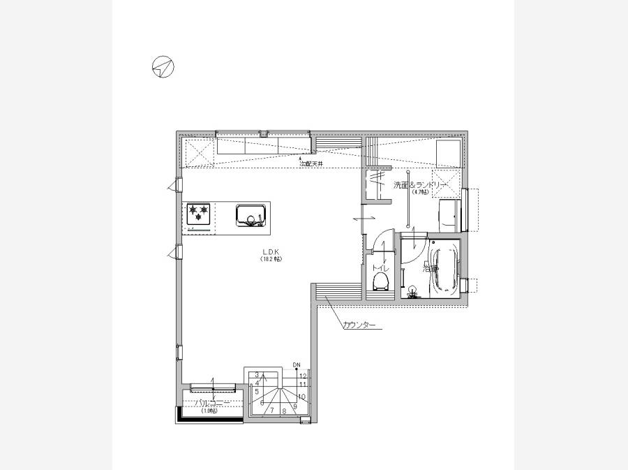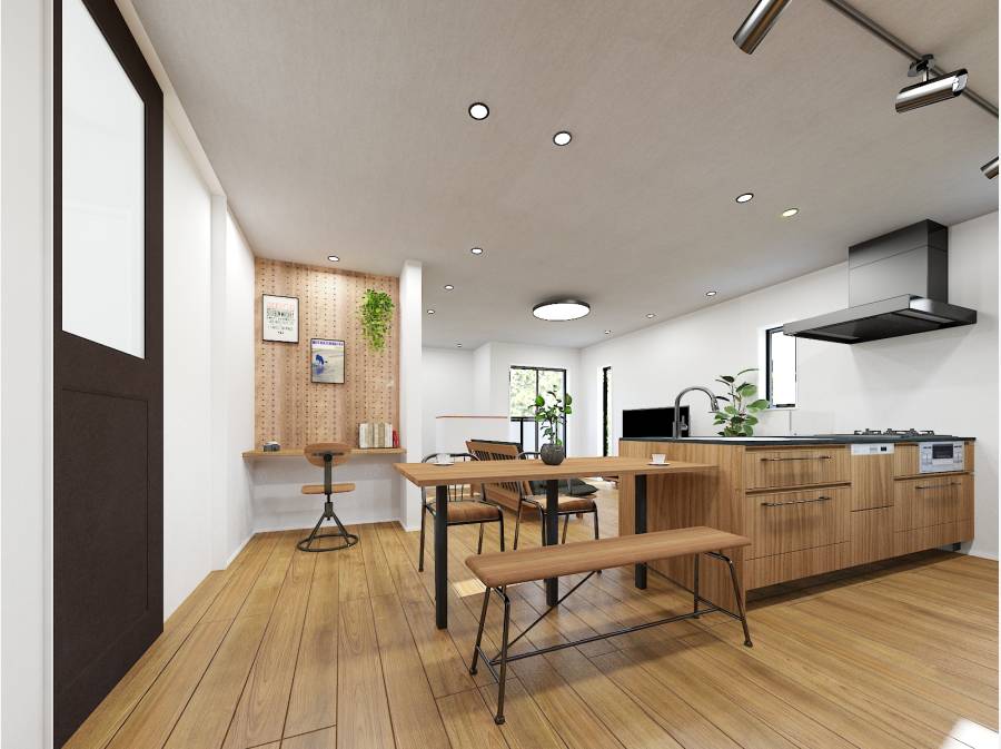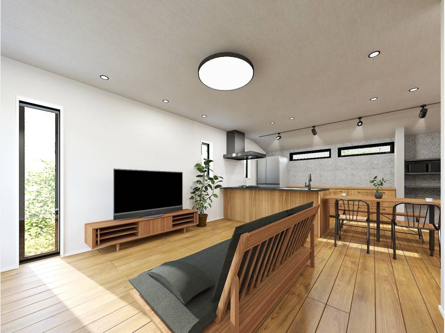18.2帖の広々LDKには、開放的なデザイン階段やセメント化粧パネルを採用し、ワイルドで遊び心ある空間を演出。