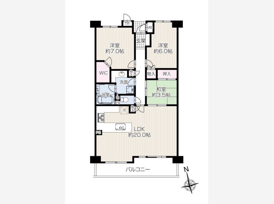 間取りは和室を含む3LDK。各居室に収納スペースを備えており、ご家族でもゆとりある生活が可能です。リビングダイニングには床暖房を完備しており、冬場も快適にお過ごしいただけます。
