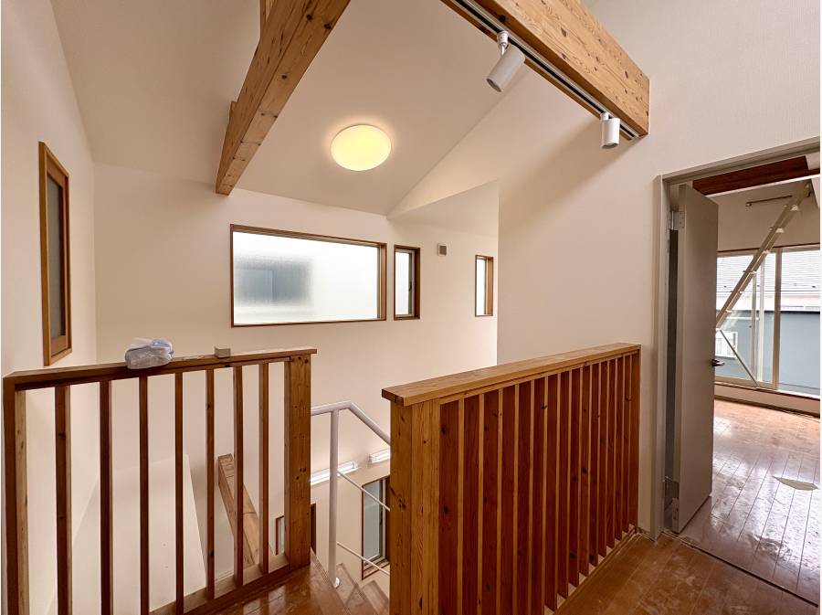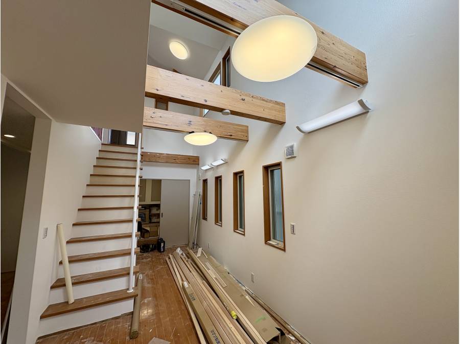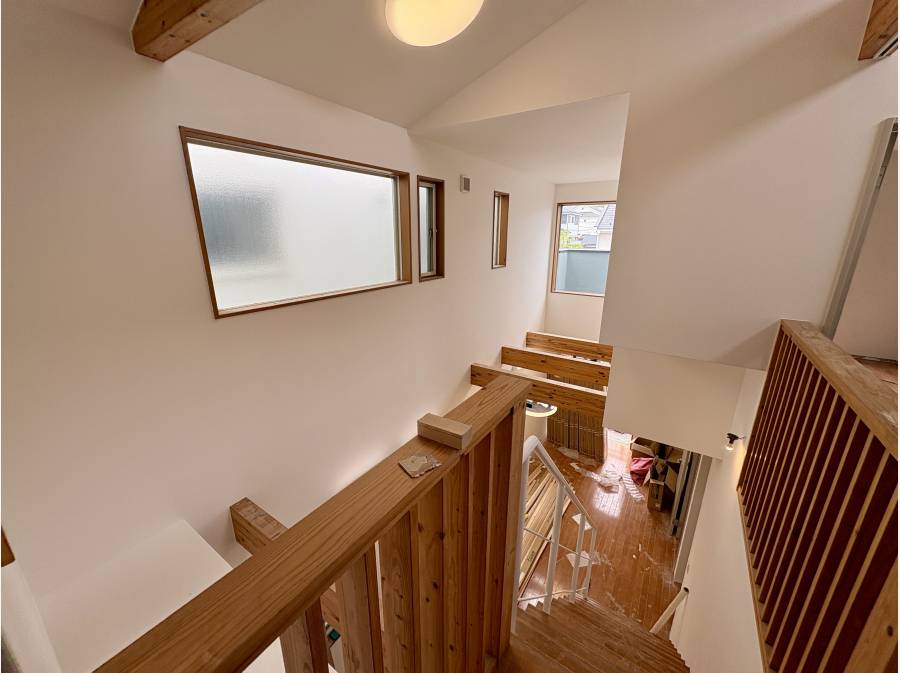 吹き抜けには大きなFIX窓。開放感のある現地は陽当たり良好です。