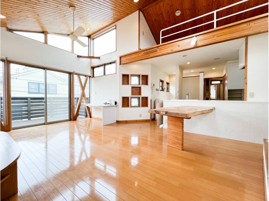 湘南・鎌倉の街並みに合う広いウッドデッキと勾配天井の開放的な空間が印象的な建物