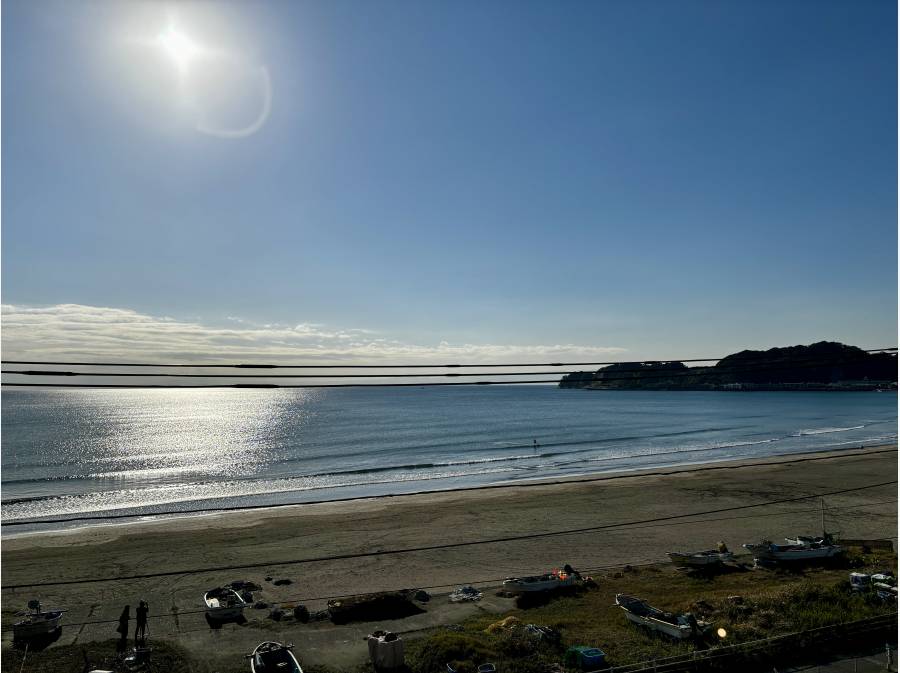 目の前に広がる材木座海岸、どこまでも広がる青い海を一望するロケーション。