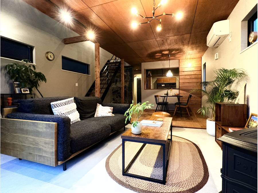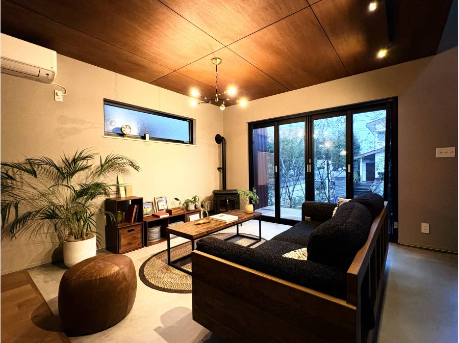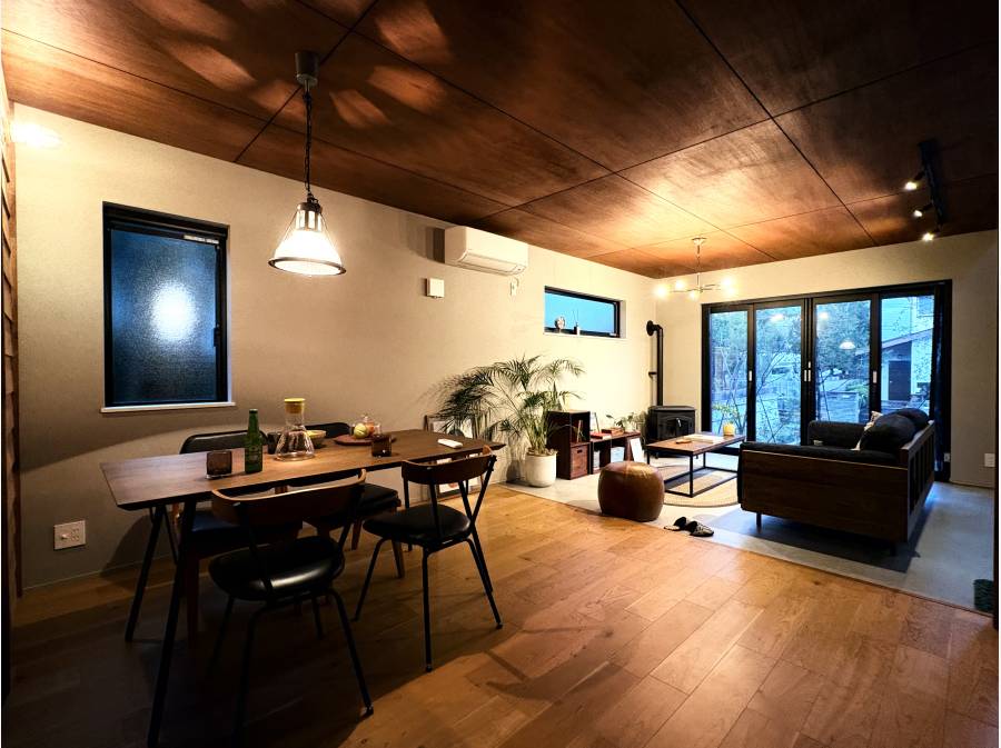 室内は無垢材の質感を活かした贅沢な設え。リビングからデッキへと視線と動線がつながり、朝のコーヒーや休日のブランチも優雅な時間に。