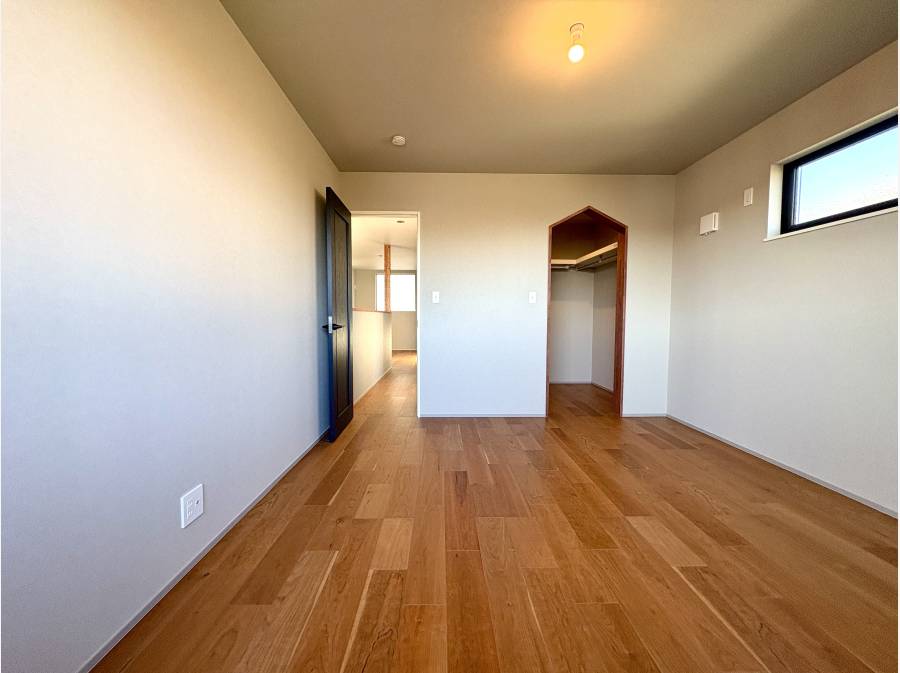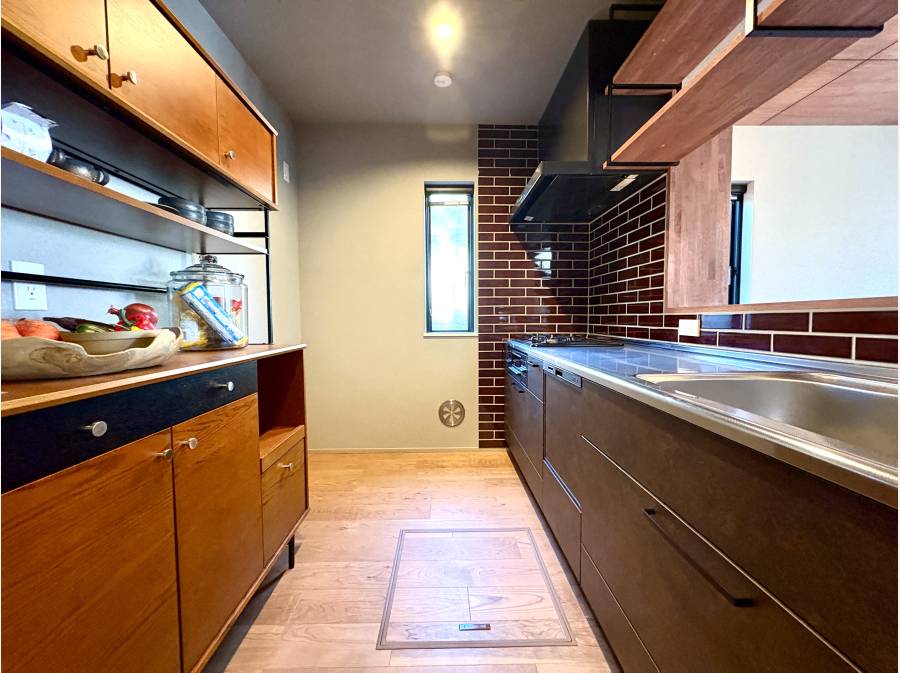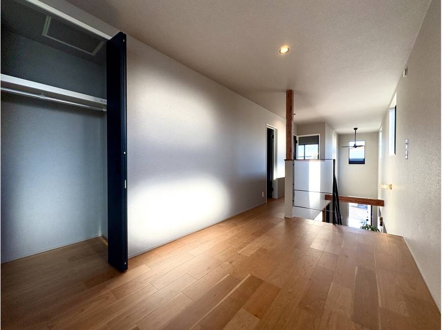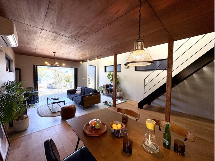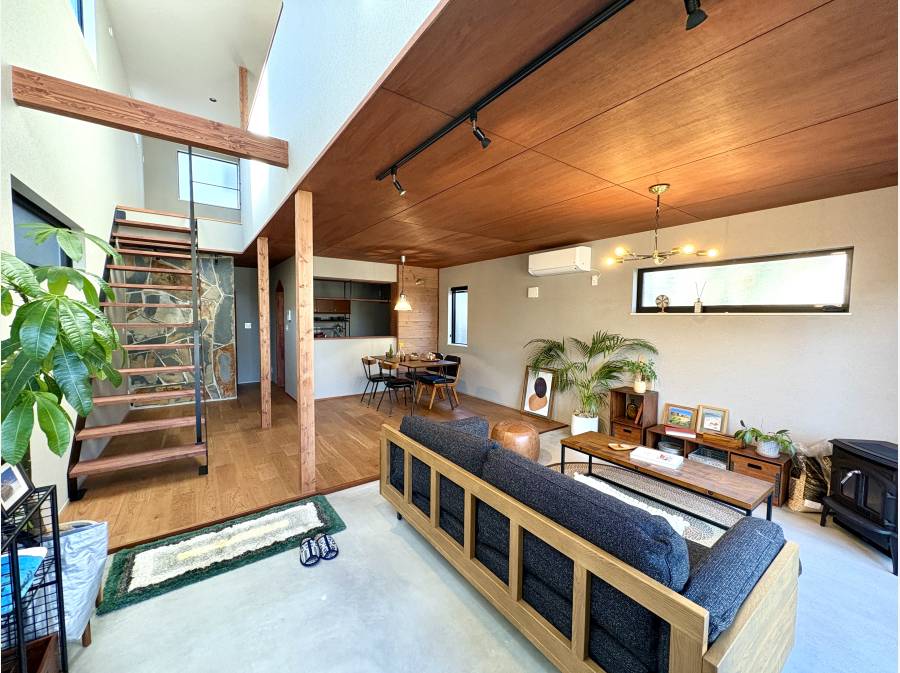 約25帖のLDKは広さ以上のゆとりを感じられ、アイアン階段や造作家具のアクセントが生活に楽しさと心地よさをもたらします。二階にはお子様の遊び場やワークスペースとして使えるフリースペースがあり、暮らしに柔軟性を生み出します。ウォークインクローゼットやパントリーなどの収納計画も充実しており、ほどよく生活感を隠しながら整った暮らしを続けられるようデザインされています。