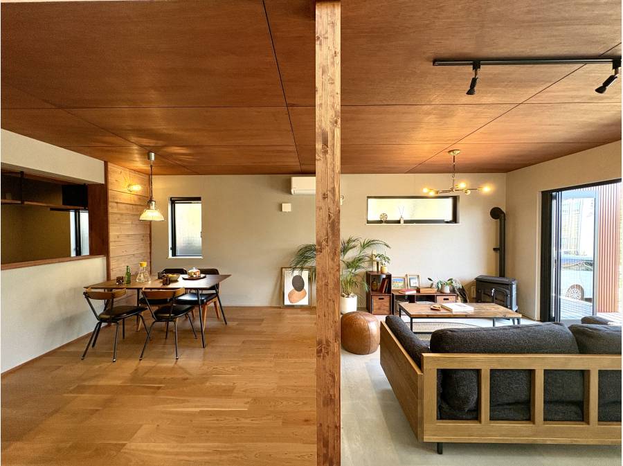 玄関を開けると、外と内が自然につながる大きな土間リビングが迎えてくれます。ウッドデッキへと広がる空気の流れは、この土地だからこそ生まれる開放感です。石張りの壁や無垢材の表情、ペレットストーブの炎が織りなす温かさは、家族が自然と集まる居心地のよい空間をつくり上げています。
