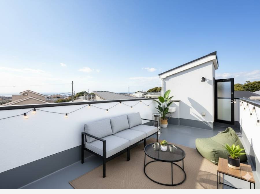 この物件の最大の魅力は、ルーフバルコニーからの眺望です。遮るもののない開放的な空間から、きらめく湘南の海をパノラマで望むことができます。潮風を感じながらの朝食や、美しい夕日を眺める時間など、日々の暮らしが特別なリゾート体験へと変わります。