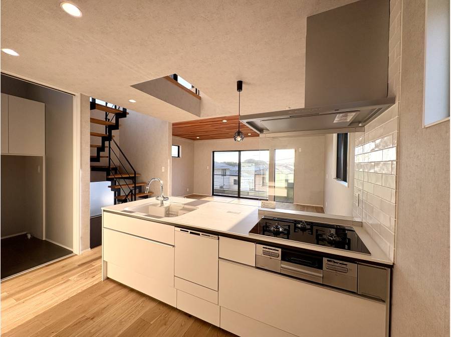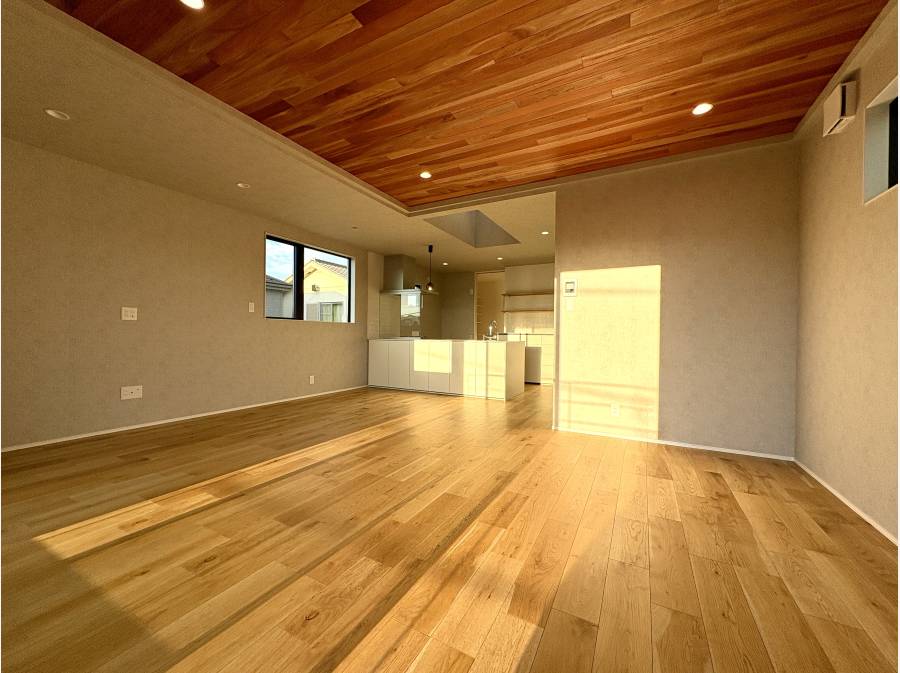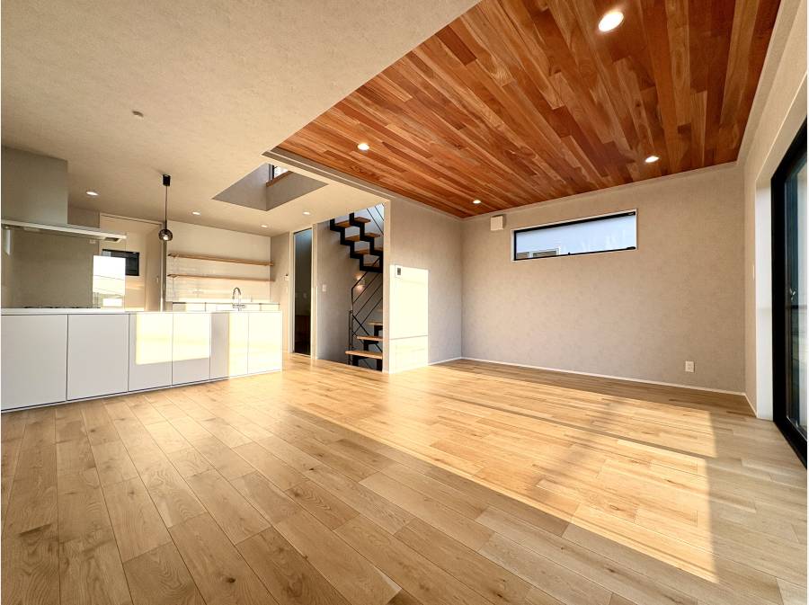 吹き抜けのある約20帖のLDKは、自然光がやわらかく差し込み、家族が自然と集う空間に。