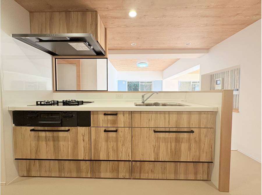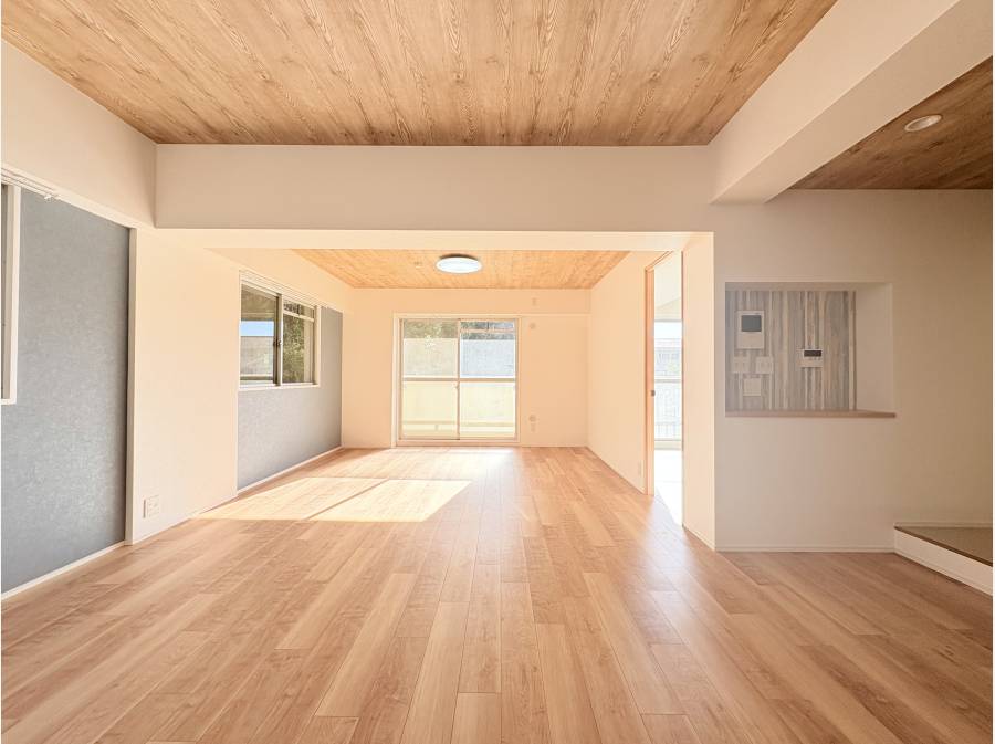 室内を入ると、木のフローリングと木目調の天井が優しくお部屋に広がります。