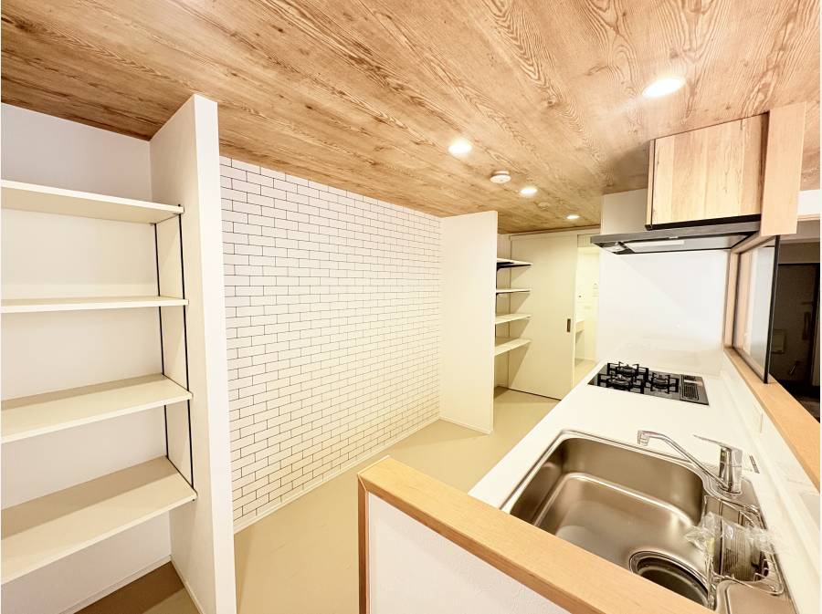 サニタリースペースからキッチンまで繋がっており、広々としたパントリーも。