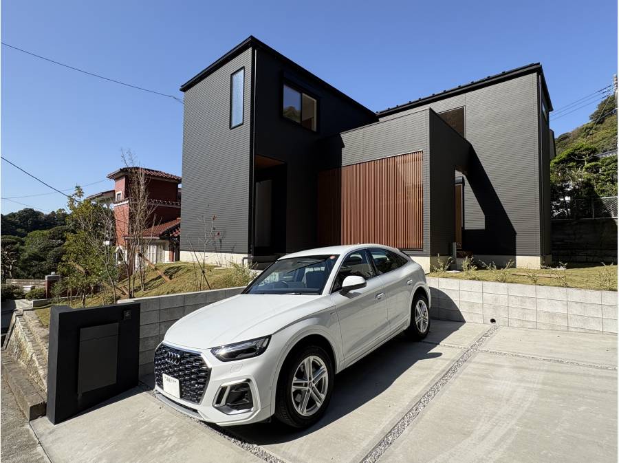黒を基調とした外観には木目の目隠し格子がアクセントに。