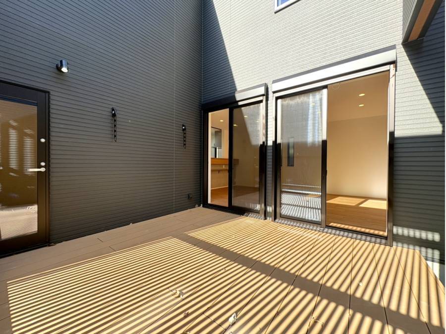 約20帖のLDKから繋がる8帖のウッドデッキは、格子で守られたプライベートな特等席。朝のコーヒーも、星降る夜のシャンパンも、四季の移ろいを肌で感じながら日常のワンシーンに。