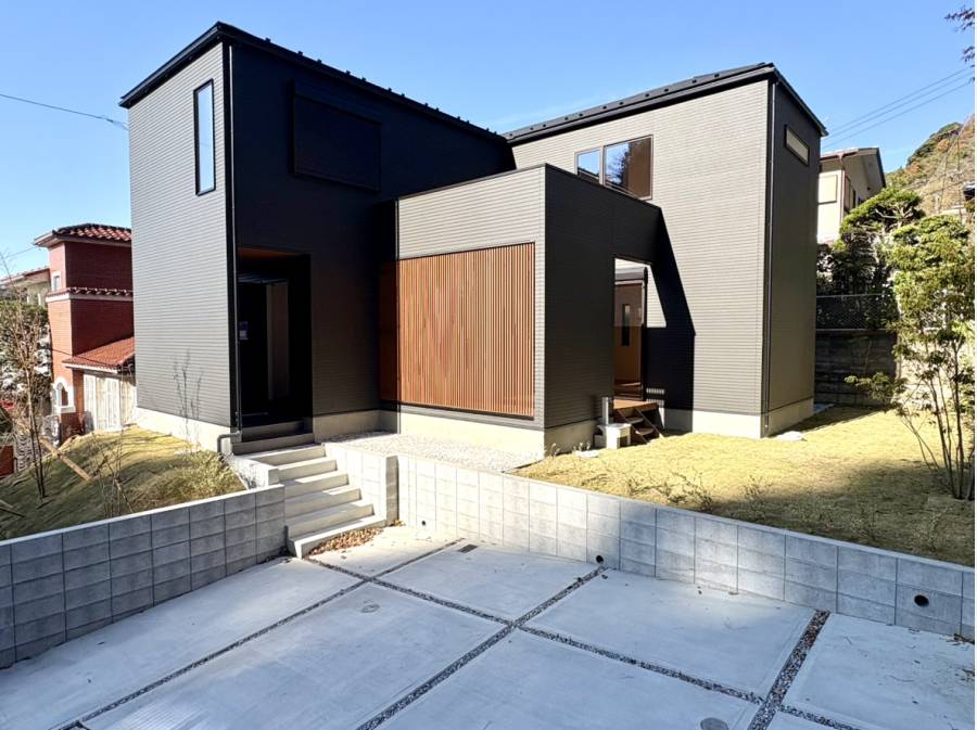 外観は、緑豊かな鎌倉の風景に調和する、シックなブラックと温かみのある木目調の格子が印象的。