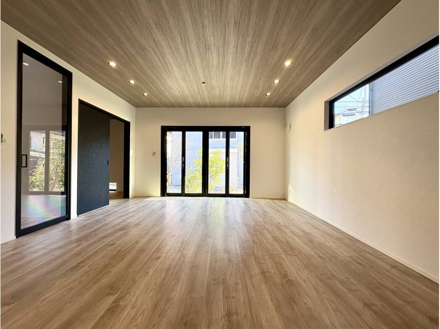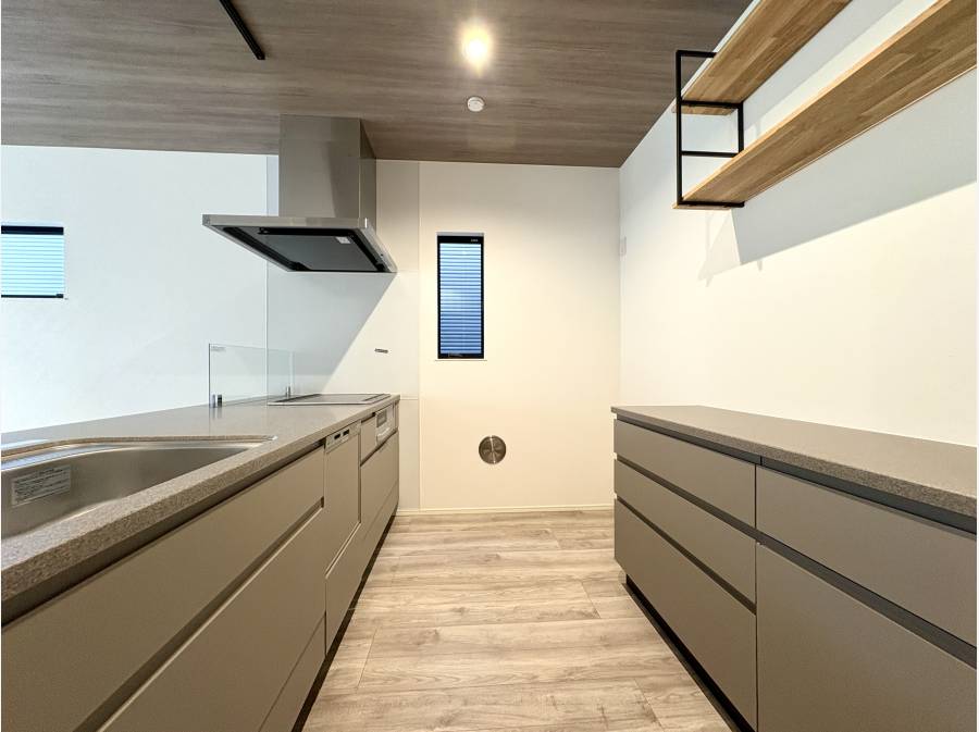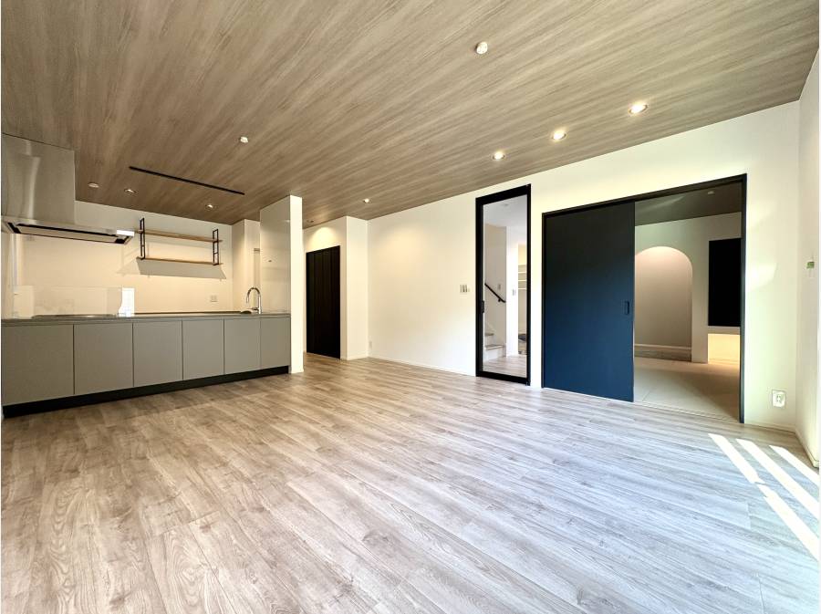 18帖超のLDKは木の質感が生きる仕様で、キッチンまわりの収納や天井の素材感が空間に豊かな表情をつくり出しています。