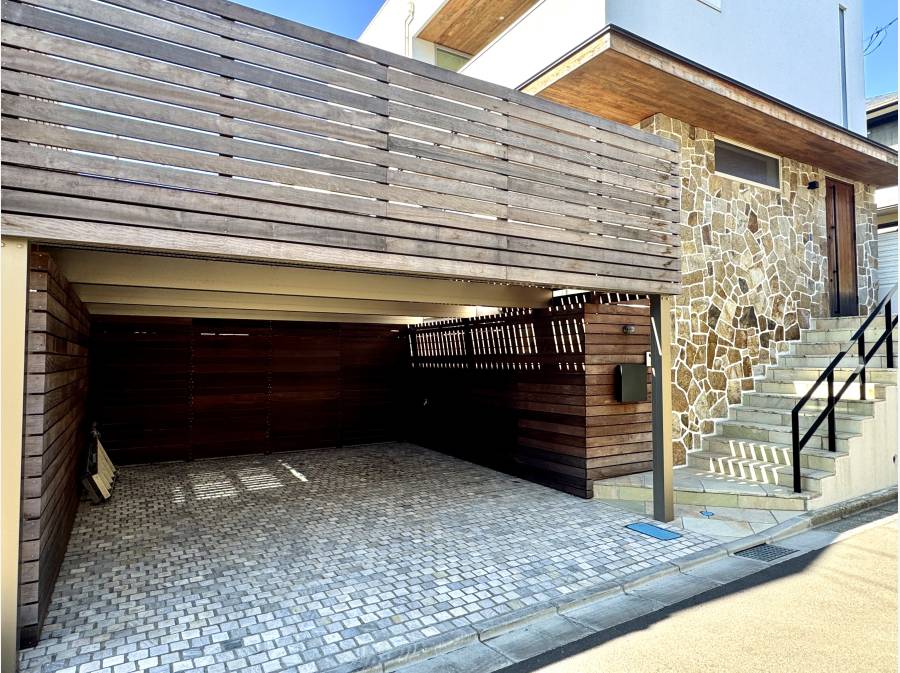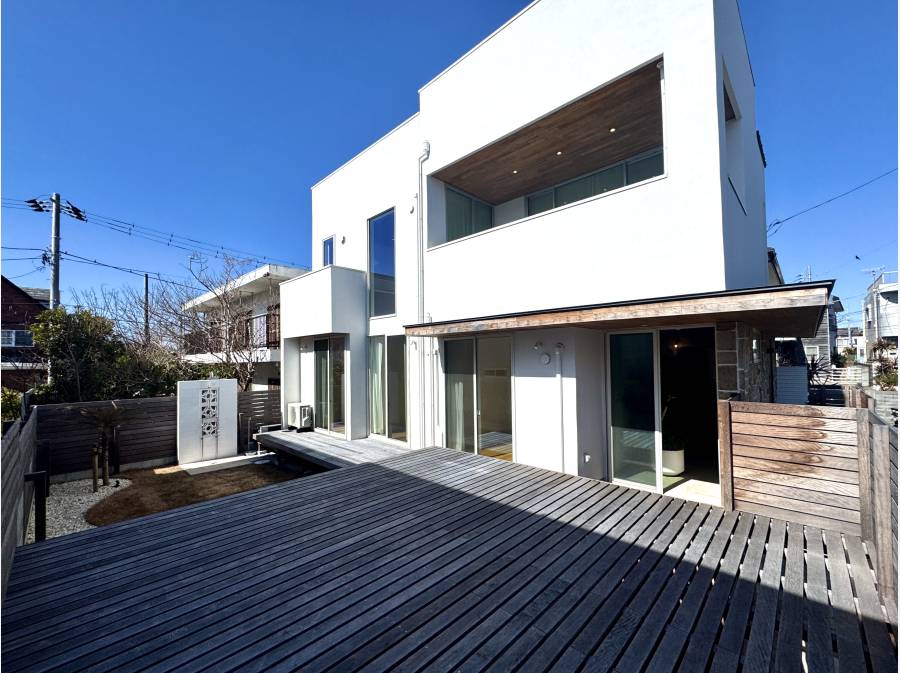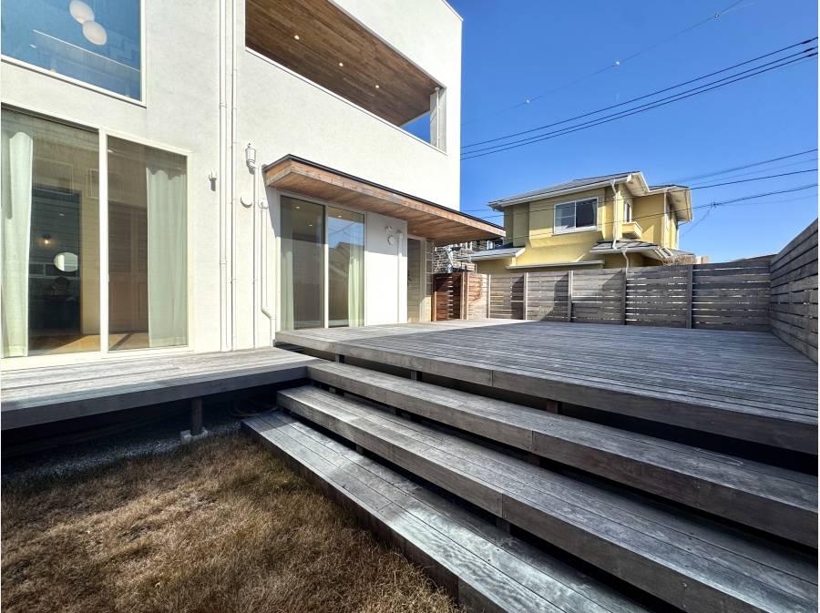 カースペースの上をお庭にするというダイナミックな施工により敷地以上に広く感じる大開放のウッドデッキ&芝生の外空間