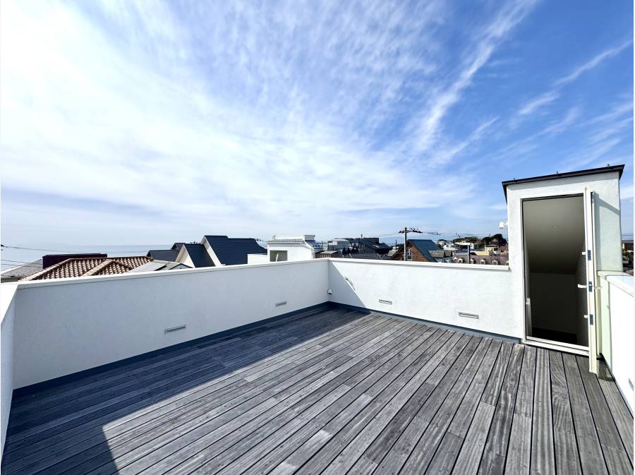 約21帖の広々バルコニーは住空間と一体になり、屋外の心地よさを最大限に堪能できます。シャワー設備も備わり、海遊びのあとも快適です。特にルーフバルコニーからは、海・江ノ島・富士山のパノラマビューが広がり、時間と共に移ろう絶景を独り占め。
