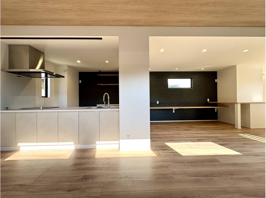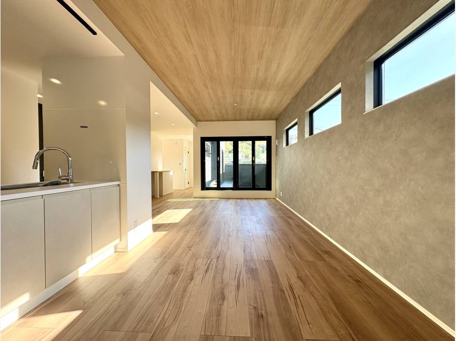 室内に入ると、約24帖のLDKが広がり、大きな窓の向こうに緑が重なる風景が目に飛び込んできます。