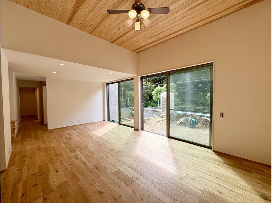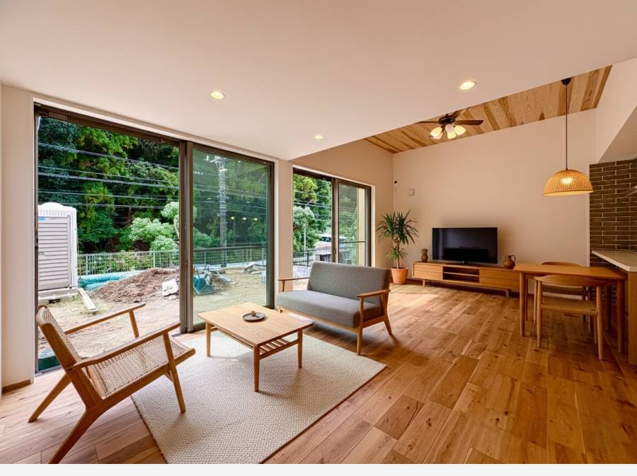 リビングの大きな窓からは、まるで森の中にいるような自然豊かな借景が広がり、日々の暮らしに癒しを与えてくれます。