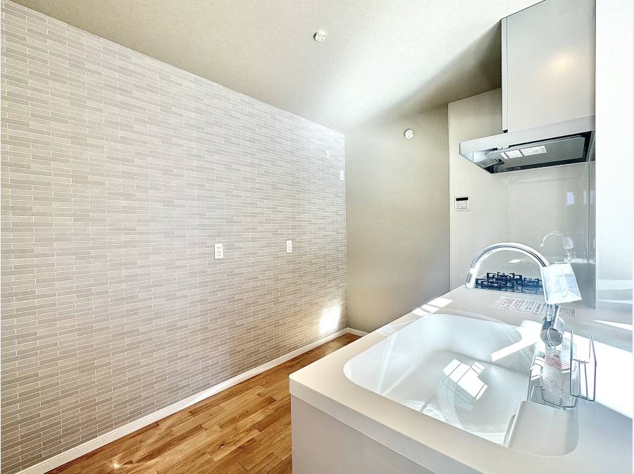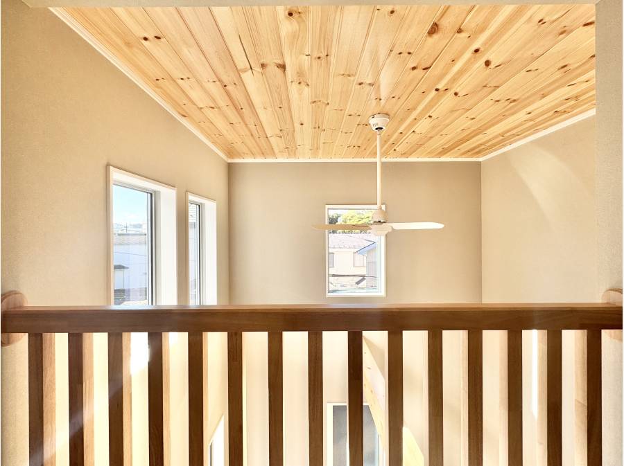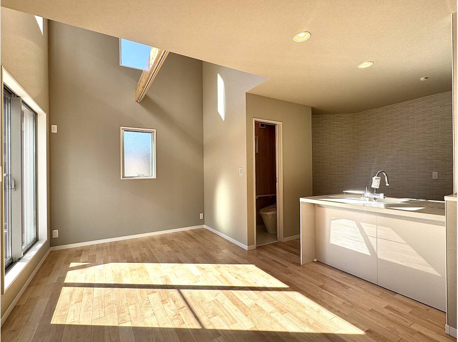 南西側道路に面した住まいは、日当たりと開放感を確保。LDKは吹抜け天井を採用し、光と空気が心地よく巡ります。家事動線を考えたワイドキッチンや、約6.5帖の小屋裏収納など、日々の暮らしを快適にする工夫も随所に。