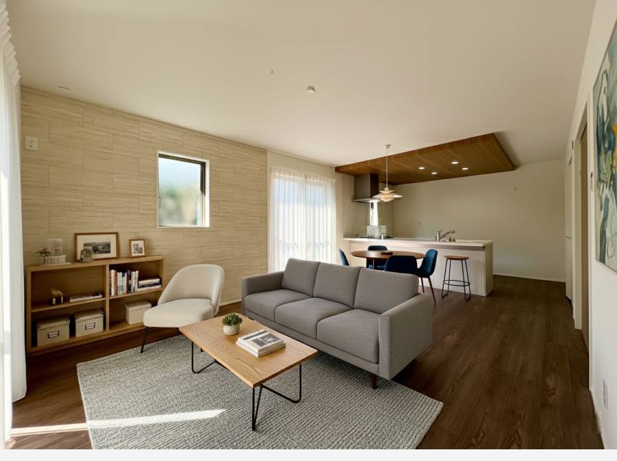 間取りは広々とした4LDKで、特にLDKは和洋室と繋げることで約20.5帖の大空間に。木目調のフロアとアクセントクロスが配された開放感たっぷりの空間は、家具を配置することでさらに魅力的な仕上がりになります。
