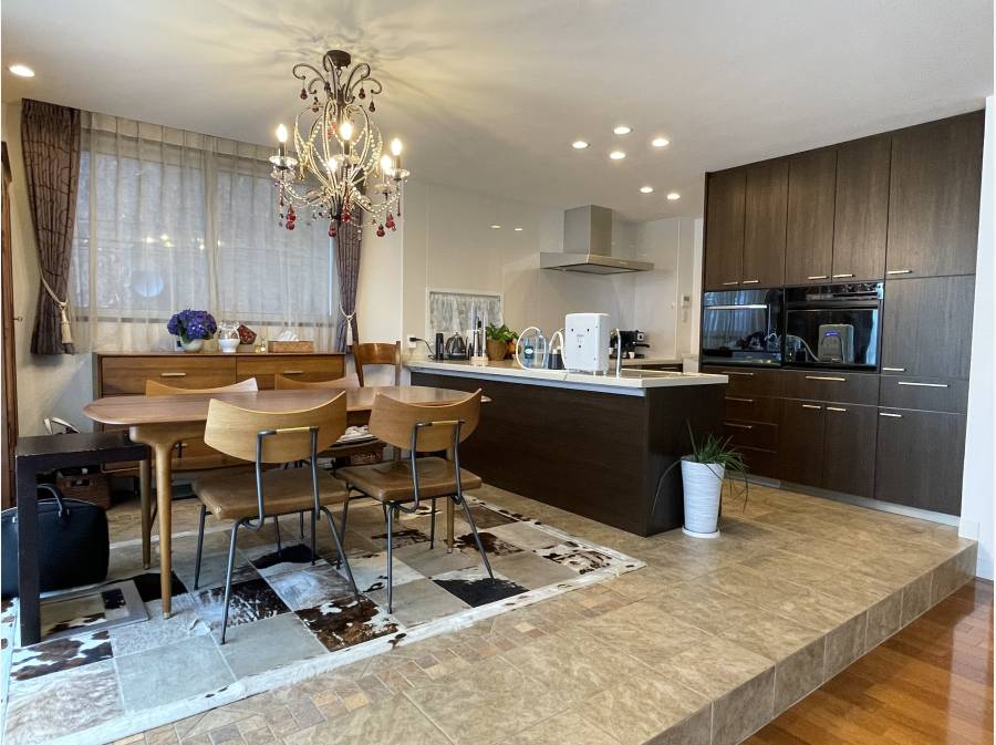 約31.3帖の広々LDKは、段差を生かしたメリハリのある空間構成で、洋風のスタイルが雰囲気を演出。