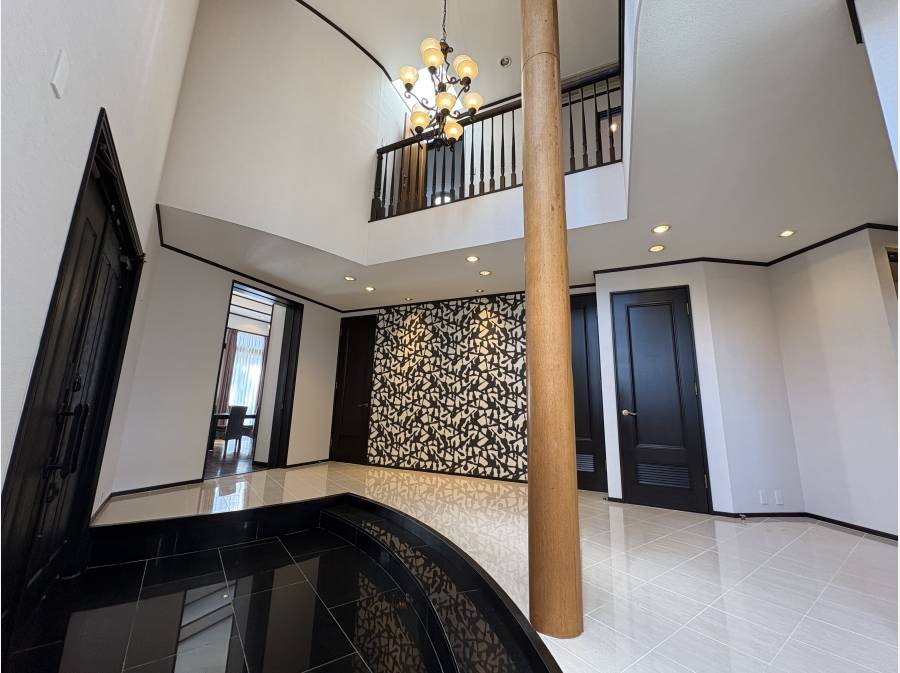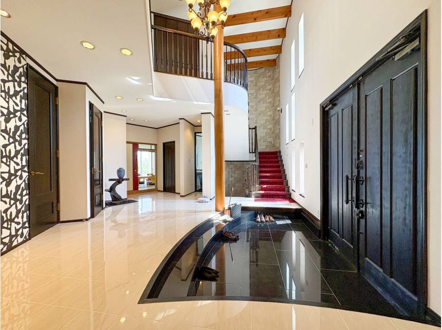 玄関ホールは吹き抜けと階段で演出していて、暖炉のあるリビングや2階の檜張バスルームにはサウナもあります。