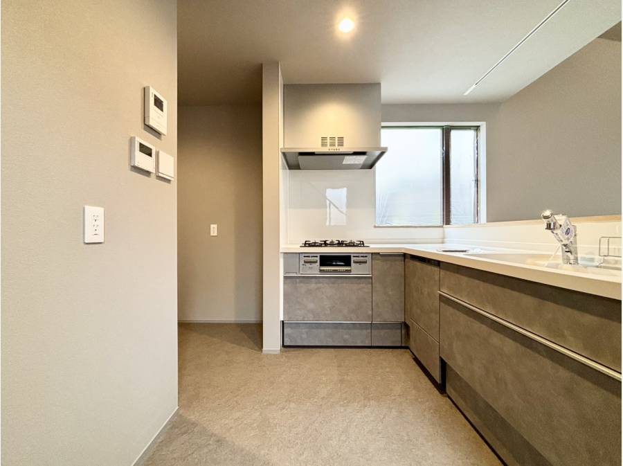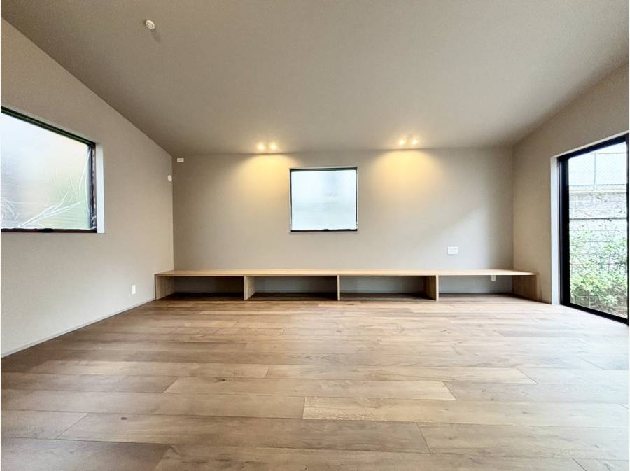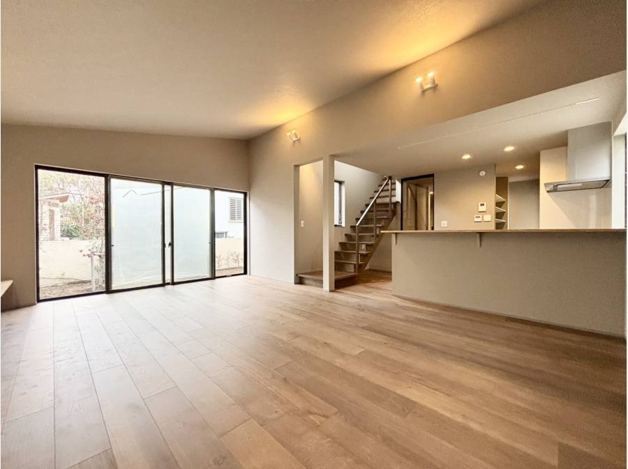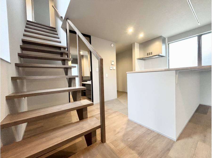 一階はガレージと直結した玄関で、雨の日の帰宅も快適。南向きに大きく配置されたLDKは、家族が自然と集まる温かな空間を演出します。キッチンはリビングダイニングを見渡せる対面型で、家事をしながらお子様の様子も確認でき安心です。水回りは玄関からの動線もスムーズで、家事効率を高める工夫が随所に。