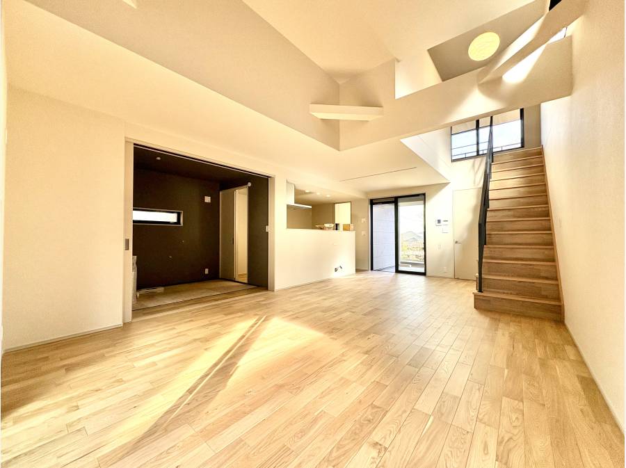最大の魅力は、リビング上部にダイナミックな吹き抜けを配した、約20.4帖もの広大なLDKです。