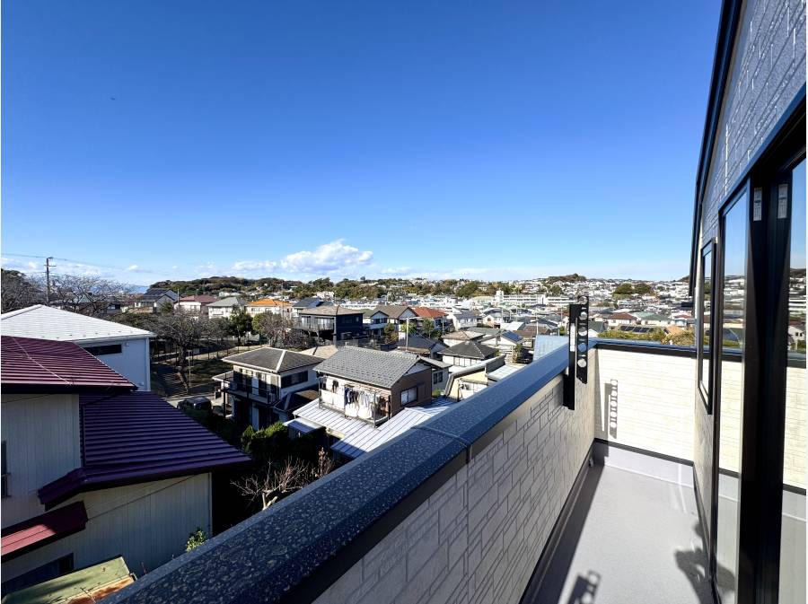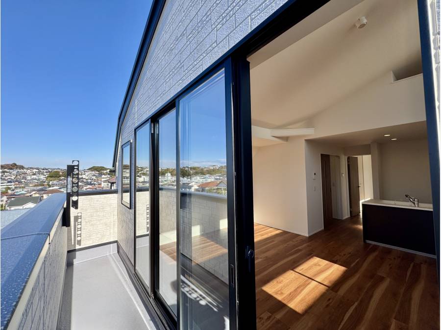 眺望: LDKと繋がるバルコニーからは、鎌倉の豊かな緑と街並み、そして高台ならではの遮るもののない広大な空を望む贅沢なひとときを過ごせます。