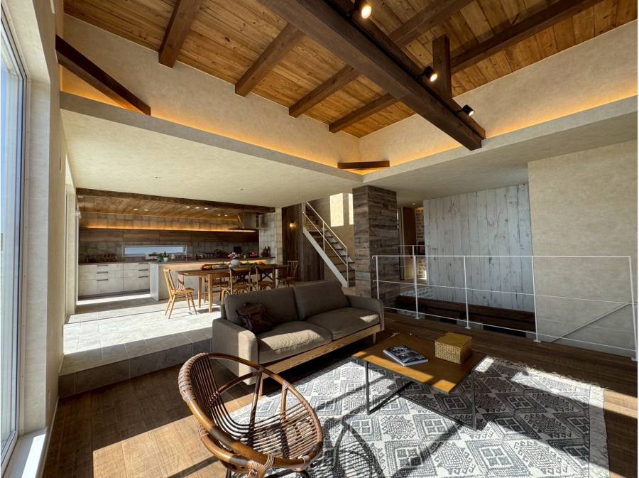 「Barn Style」と名付けられた本物件は、古材を取り入れた経年変化の味わいと、質感豊かな石壁が調和する自然を感じるデザインが特徴です。