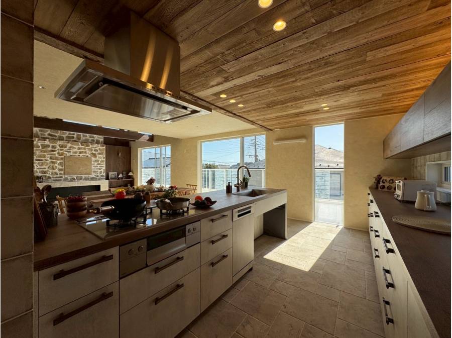 Kitchenhouse製のアイランドキッチンやバイオエタノール暖炉、吹き抜け天井が、ラグジュアリーな時間を演出します。