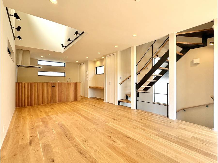 約21帖の広々としたLDKは、シーリングファン、そして空間を引き締めるアイアンのスケルトン階段が印象的で、開放感に満ちた光あふれる空間です。