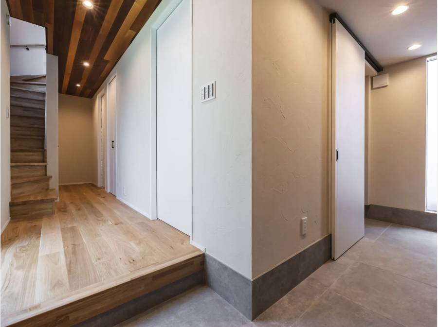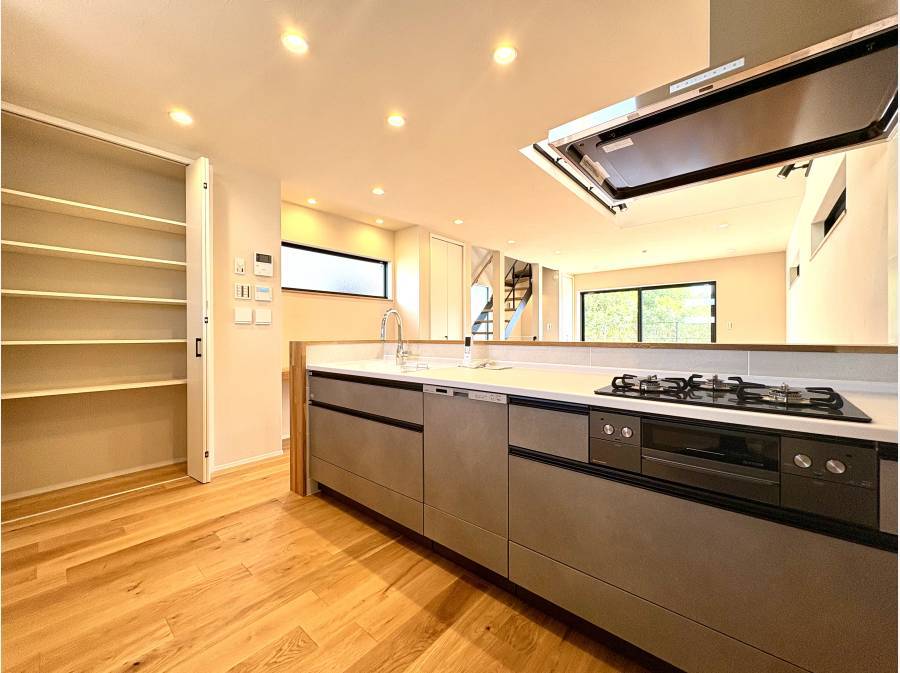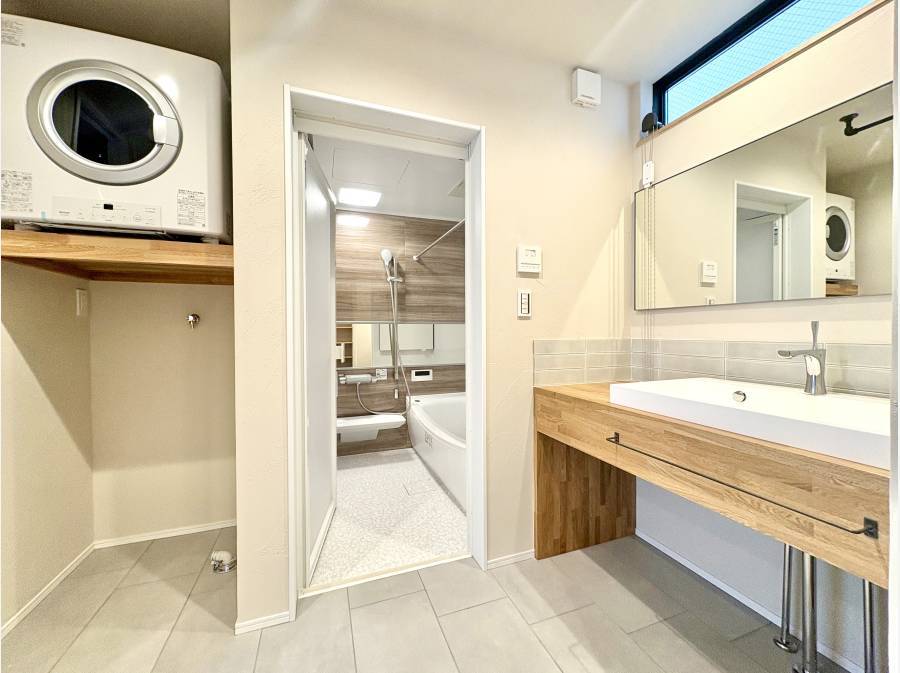 さらに、耐震等級3、省エネ基準適合の確かな性能に加え、家事時短を叶えるガス衣類乾燥機「乾太くん」も標準装備されています 。細部には造作の洗面台やカウンターなど、こだわりが光る洗練された空間です 。