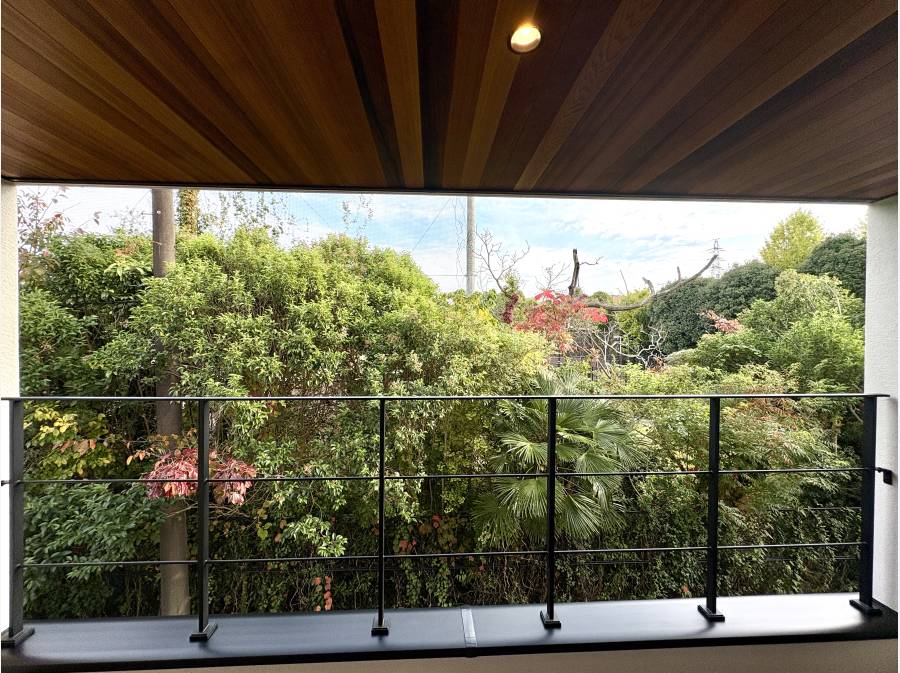 リビング前のバルコニーには、緑が映える隣地の借景が広がります
