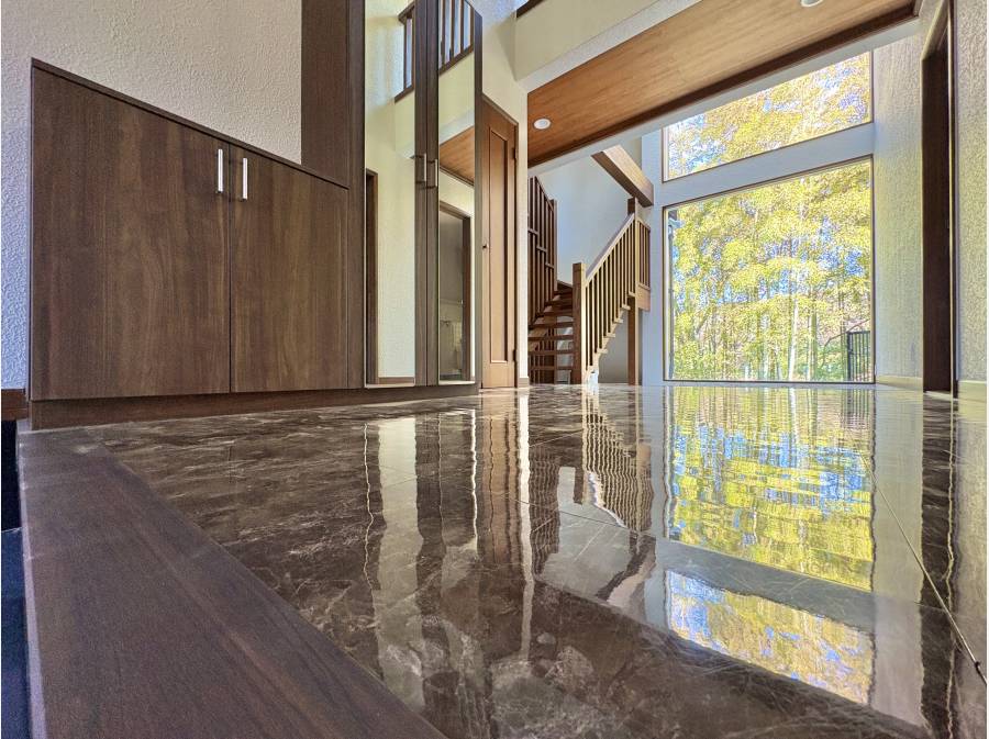 玄関ホールには大きな窓があり、その先には美しい竹林が広がります。