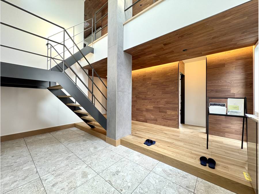エントランスホールには印象的な鉄骨階段と吹き抜けを設え、住まう人をドラマチックに迎え入れます。