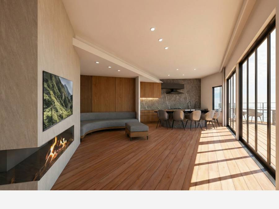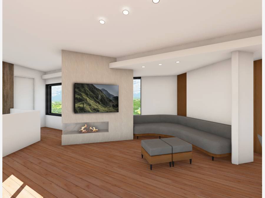 船を思わせるキッチン、そして海を眺めながら寛げるラウンジのR形状家具など、