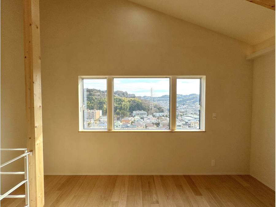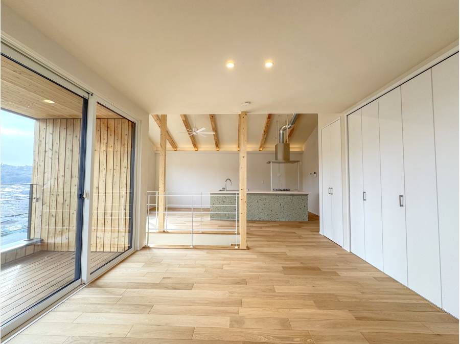 板張りのバルコニーからは山並みと住宅街を眺め、