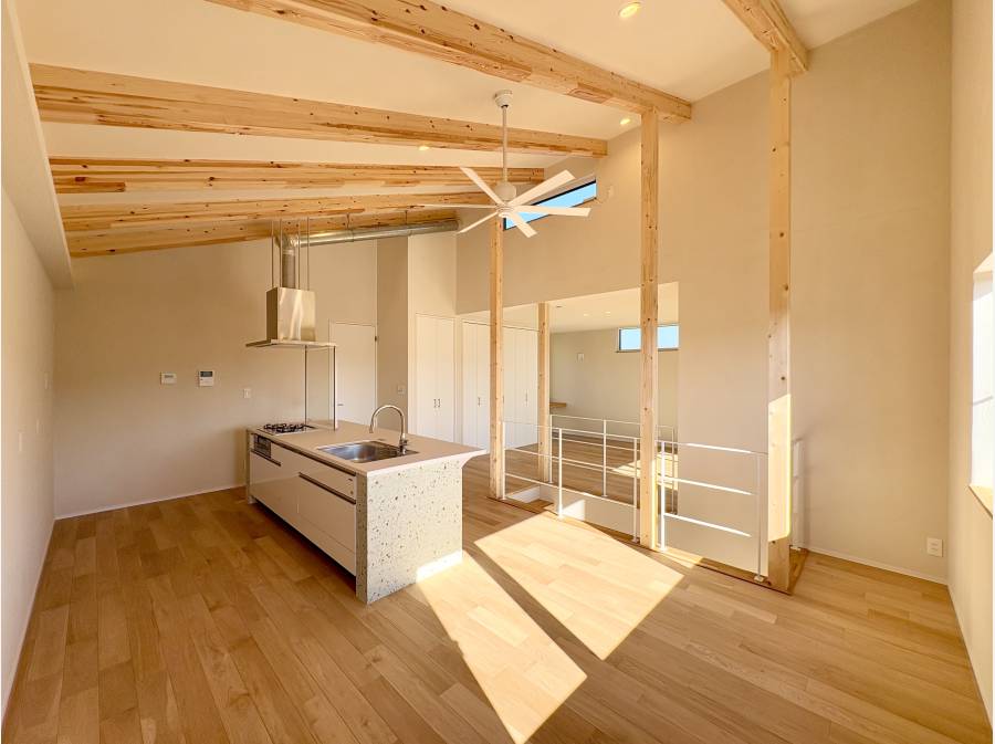 LDKは24.5帖の大空間を確保しており、天井には調湿・消臭効果のあるエコウォールや大谷石、床には無垢の突板を採用 。