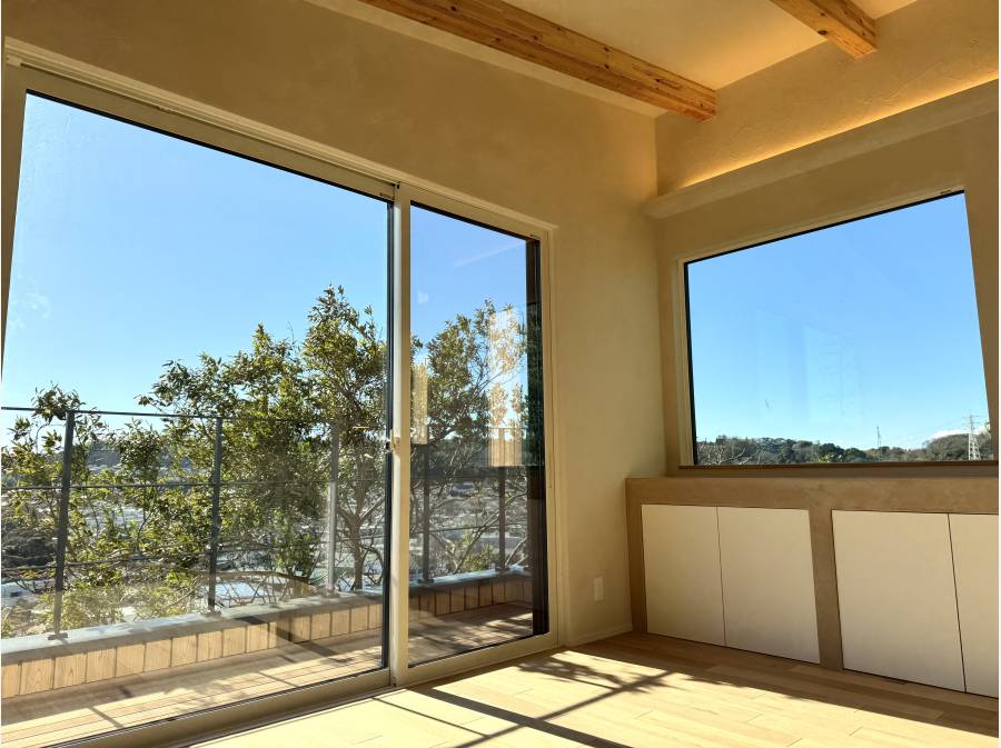 大きな窓の向こうには、空と緑が広がり、デッキには堂々とした一本の大樹。室内と外とがゆるやかにつながり、朝は木漏れ日の中で目覚め、休日はテラスでゆっくりコーヒーを楽しむ。そんな時間が自然と似合う住まいです。