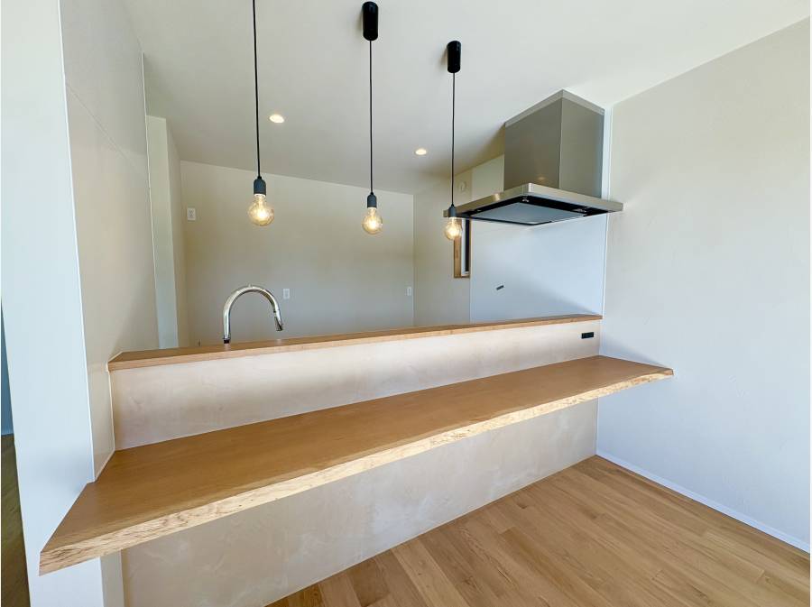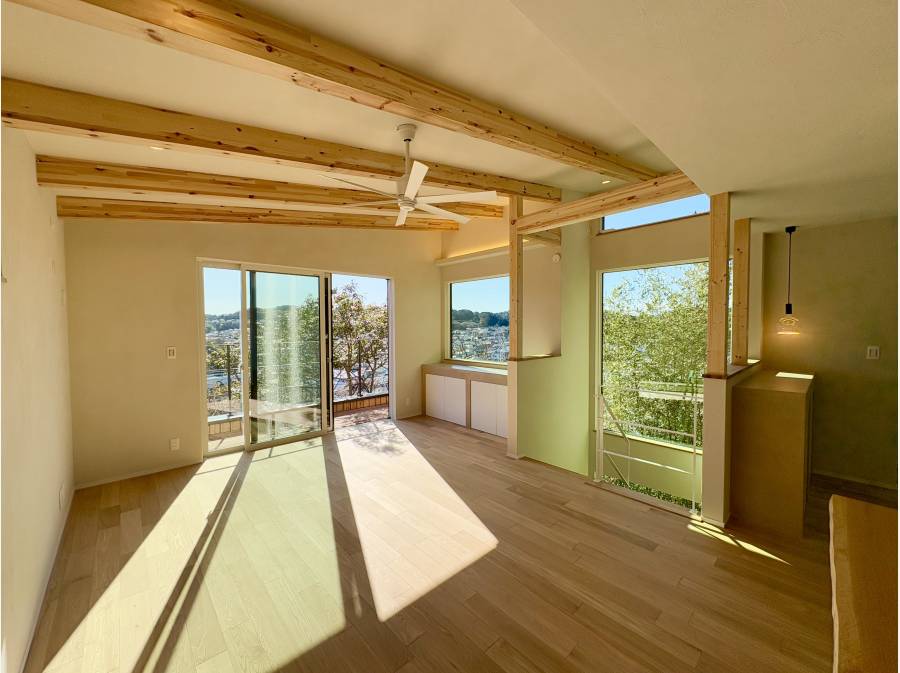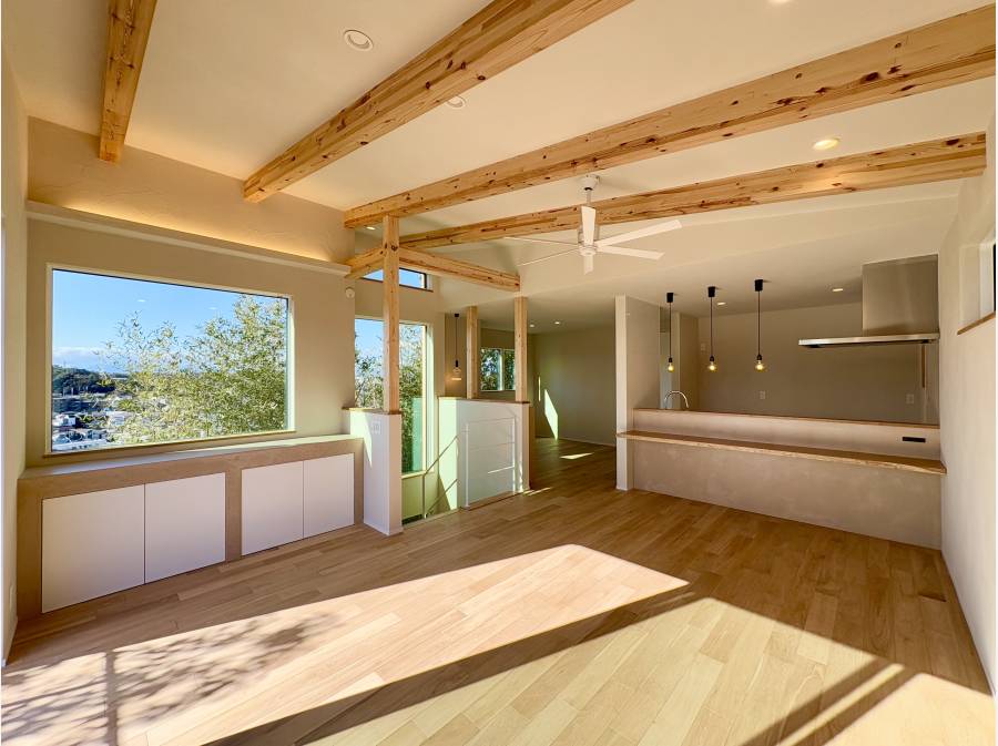 LDKは約22.5帖の大空間を確保しており、天井には調湿・消臭効果のあるエコウォールや大谷石、床には無垢の突板を採用 。