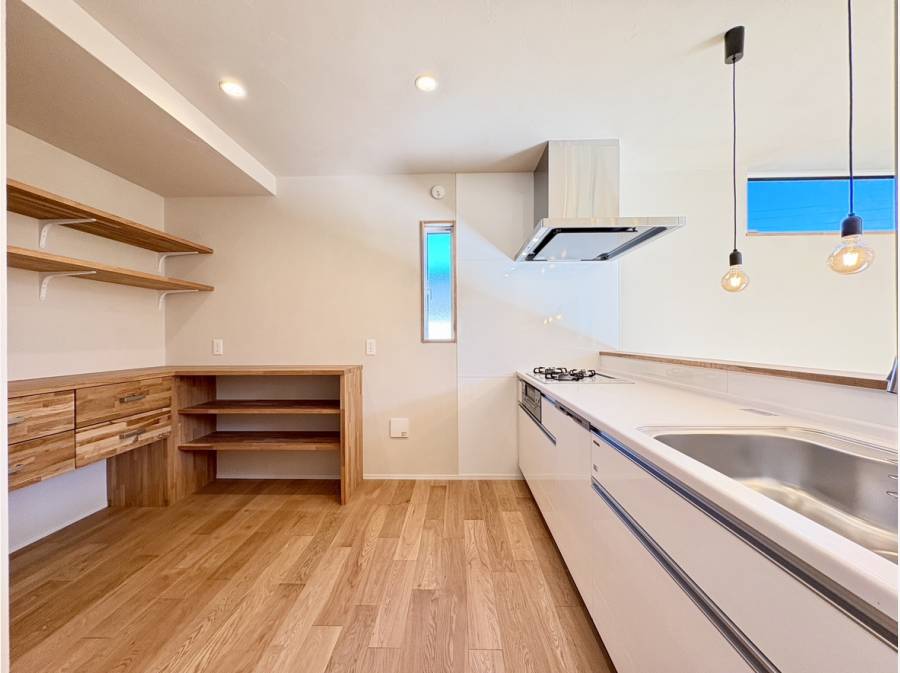 カップボード付きのキッチンスペース、LDKで優雅に回るシーリングファン、ゆとりある玄関スペース…魅力が詰まった理想のお住まい