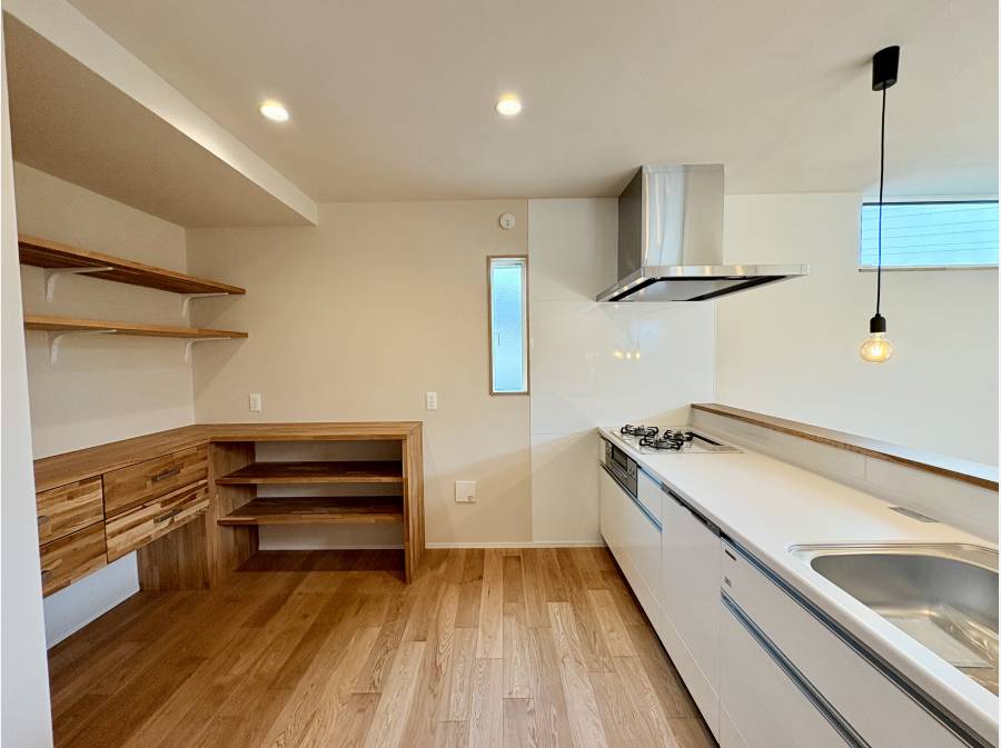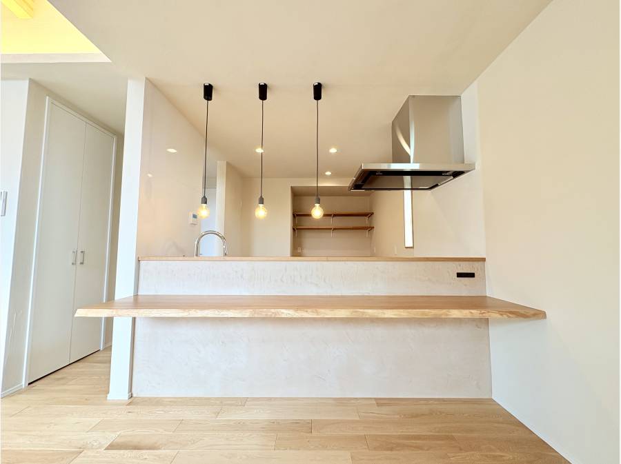 ご家族で調理を楽しむことができるほどの広いキッチンスペース。またカウンターはこだわりの感じるデザイン性。木の温もりを感じながらとても優雅な時間を楽しむことができます。