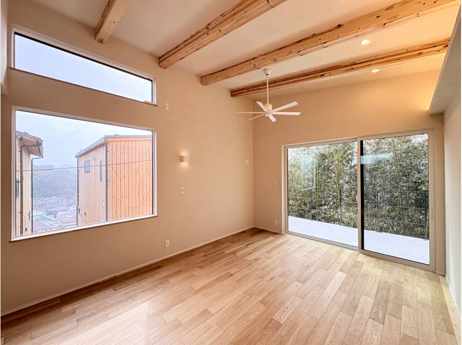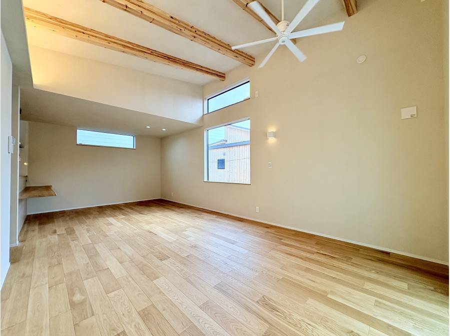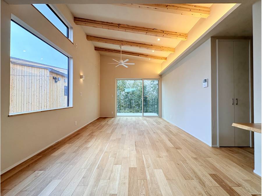 LDの16帖は勾配天井で開放的な空間。大きな窓から光が入り部屋を暖かく包み込みます。また室内壁・天井はエコウォール施工。デザイン性のある見た目が部屋をお洒落な雰囲気に。