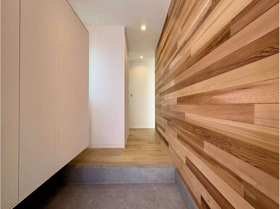 素材にもこだわり、床材や外壁、玄関壁面には突板の天然木を使用し、本物ならではの質感を追求 。全居室にハイドアを採用するなど、細部の意匠が空間に伸びやかさを与えています 。