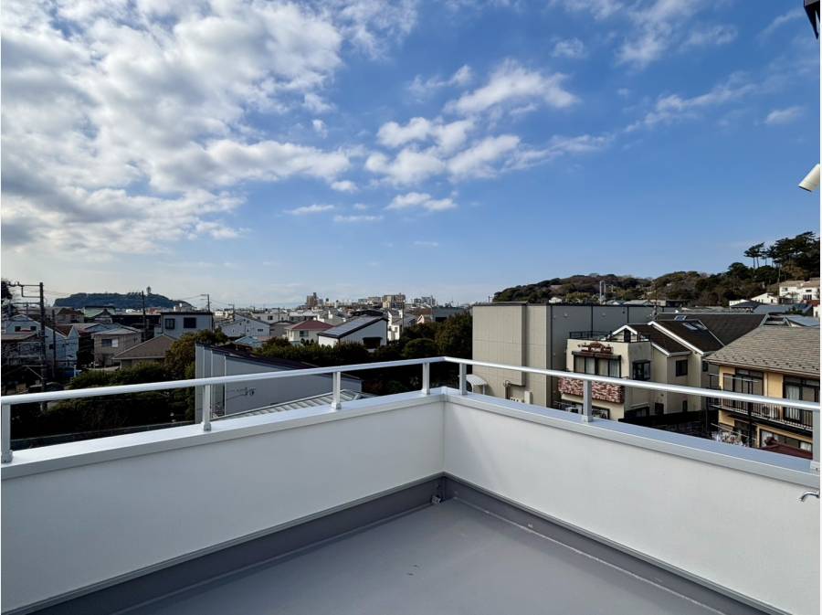 広々としたルーフバルコニーからは江ノ島を望むことができ、晴れた日には青い空と海が広がる開放的な時間を楽しめます。