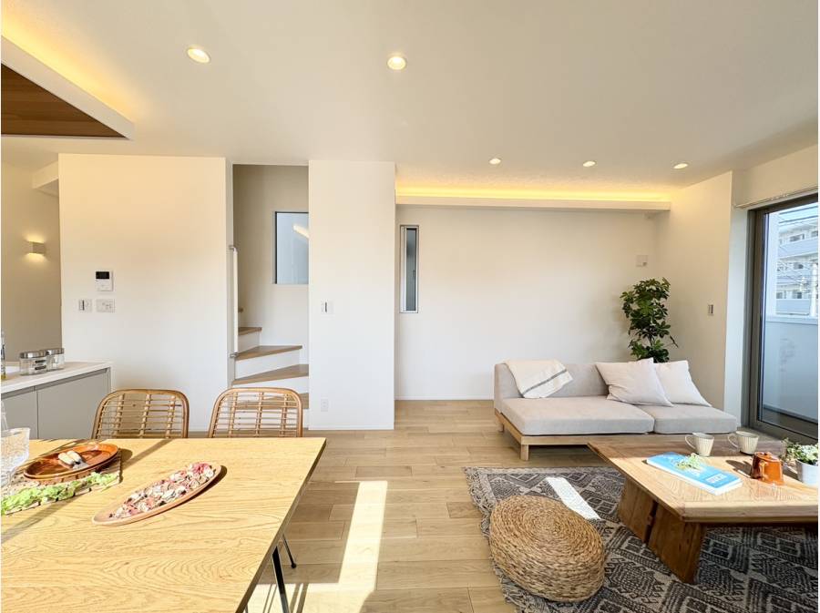 LDKは間接照明のやさしい光に包まれ、ご家族でくつろぎの時間をお過ごしいただける空間です。