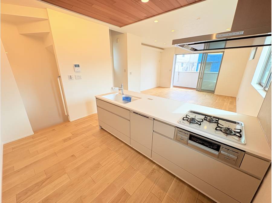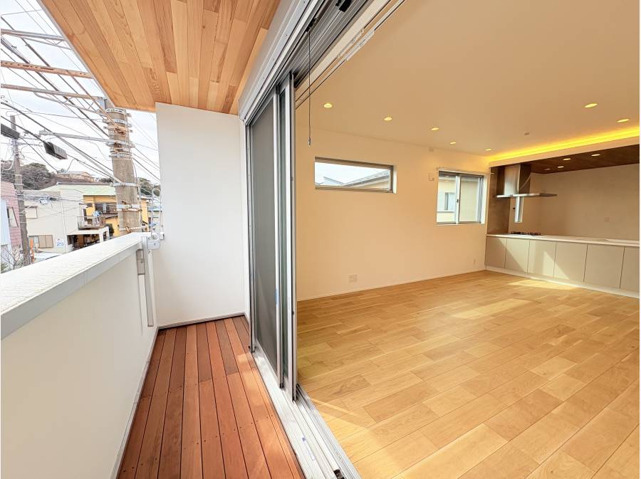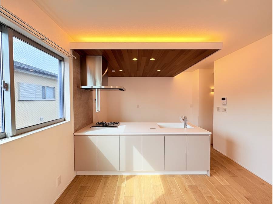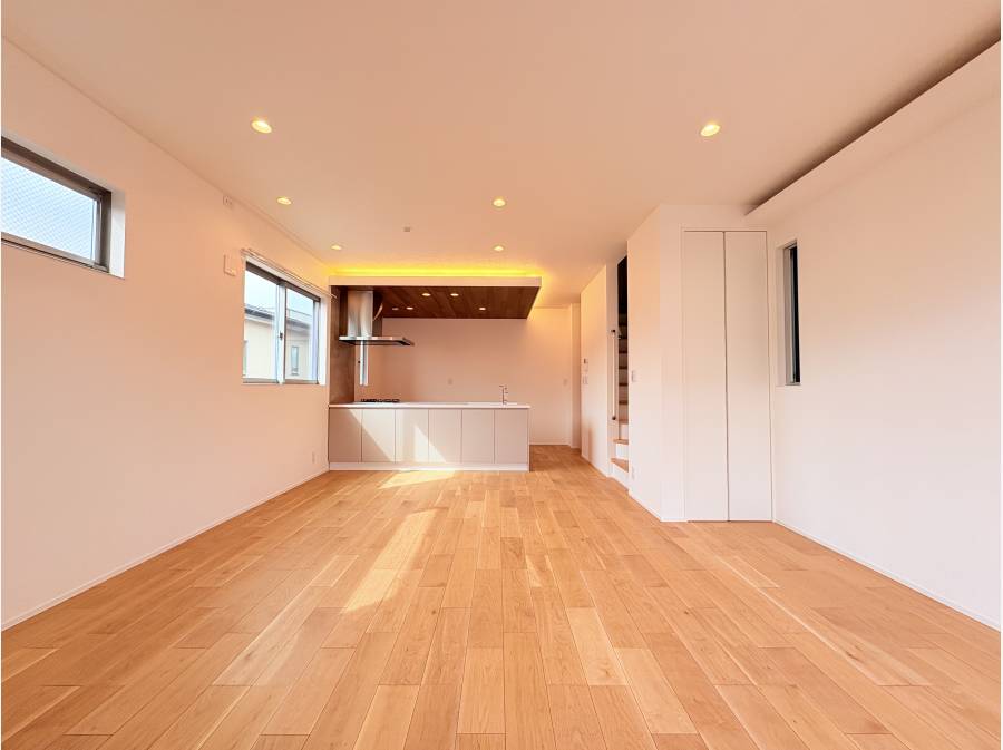 住まいの中心となる2階LDK(約17.8帖)は、天井高2.6mを確保した開放的な大空間。床材には突板の天然木を、さらに建物外壁、キッチン天井、玄関壁面にも贅沢に天然木をあしらい、五感で温もりを感じる空間に仕上げました。