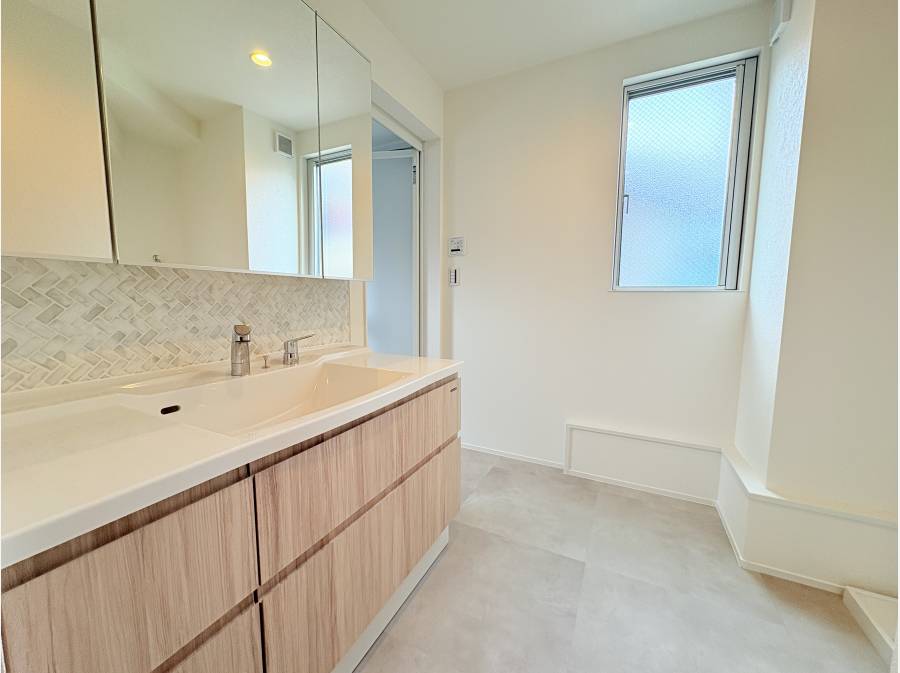 名古屋モザイクの大判タイルや、空間をすっきりと見せるハイドア、そして間接照明とダウンライトが織りなす光の演出。細部にまで意匠を凝らし、落ち着きある高級感を創出しています。