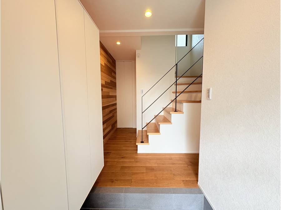 床材や外壁、キッチン天井、玄関壁面には突板の天然木を使用し、本物ならではの質感を追求しました。